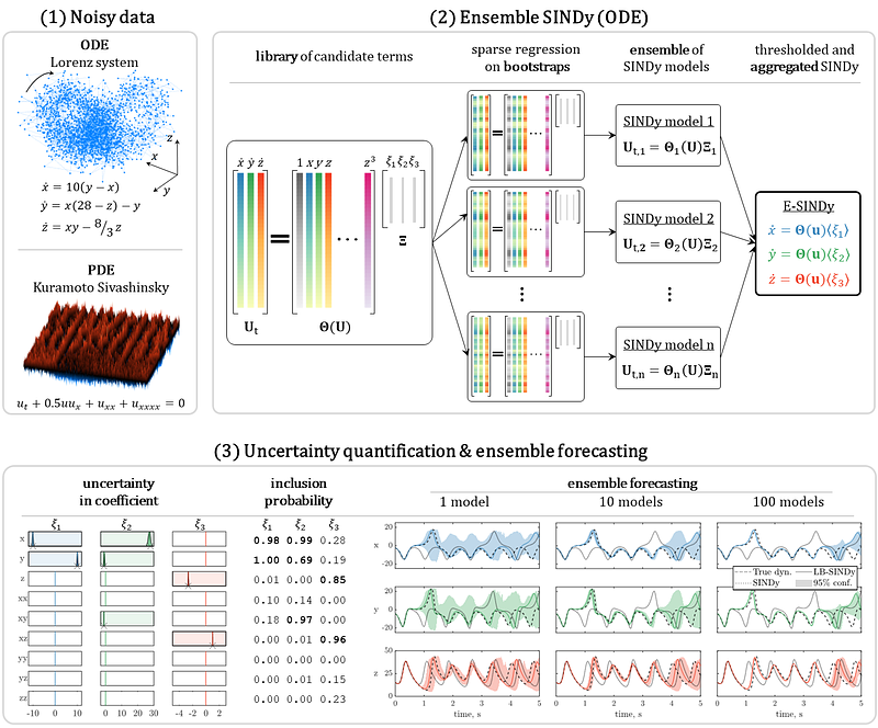 Figure: Schematic of the E-SINDy framework. E-SINDy exploits the statistical method of bootstrap aggregating (bagging) to identify ordinary and partial differential equations that govern the dynamics of observed noisy data. First, sparse regression is performed on bootstraps of the measured data to identify an ensemble of SINDy models. Mean or median of the coefficients are then computed, coefficients with low inclusion probabilities are thresholded, and the E-SINDy model is aggregated and used for probabilistic forecasting, active learning, or control.